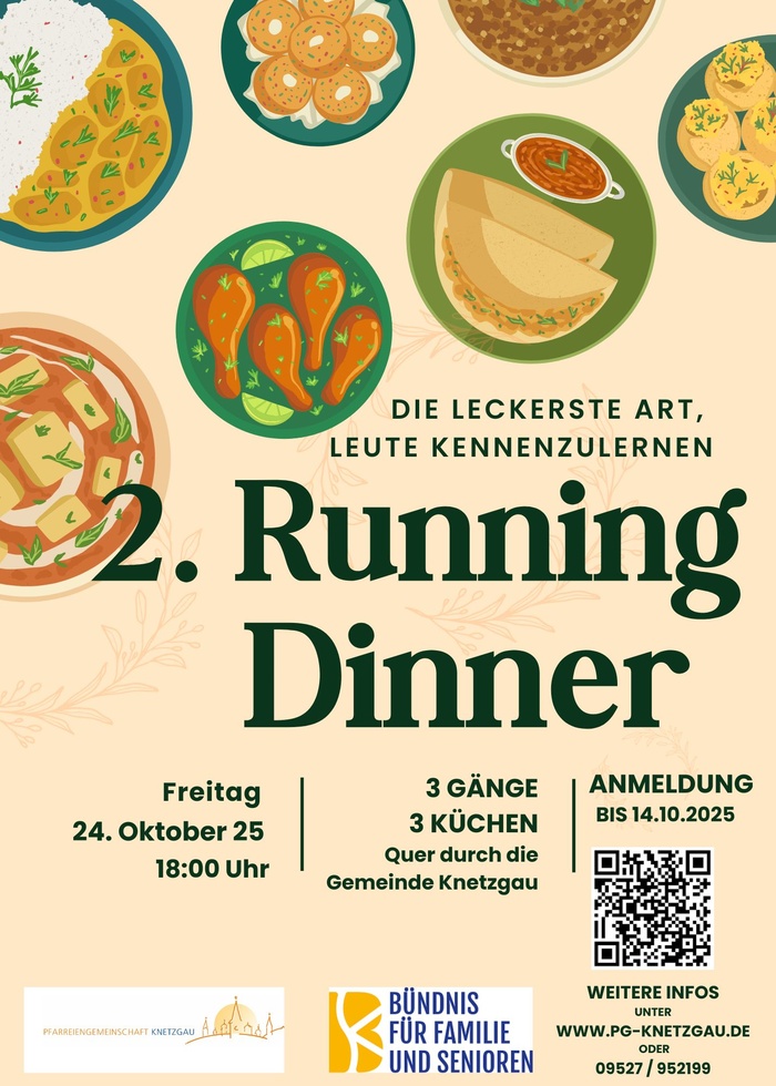 Das Running Dinner in Knetzgau geht in die zweite Runde! Am Freitag, 24. Oktober 2025 ab 18 Uhr ist es wieder so weit: Es startet ein Abend voller leckerer Gerichte, netter Begegnungen und überraschender Gespräche – in Knetzgau und seinen Ortsteilen. Wer Lust hat, Leute aus der Gemeinde kennenzulernen, ist hier genau richtig. Es laden ein die Pfarreiengemeinschaft Knetzgau und das Bündnis für Familie und Senioren der Gemeinde Knetzgau.